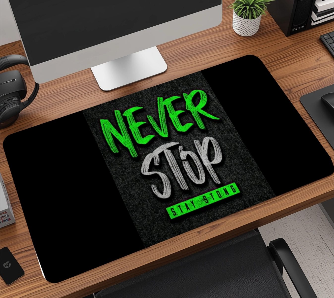 A base em borracha natural de alta densidade com textura anti-derrapante garante aderência total à mesa, evitando qualquer tipo de movimentação indesejada, mesmo durante jogadas rápidas. É esse material que faz o mousepad durar muito mais do que os modelos comuns do mercado.