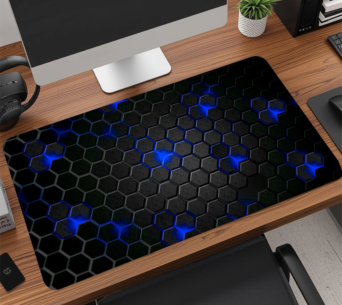A base em borracha natural de alta densidade com textura anti-derrapante garante aderência total à mesa, evitando qualquer tipo de movimentação indesejada, mesmo durante jogadas rápidas. É esse material que faz o mousepad durar muito mais do que os modelos comuns do mercado.